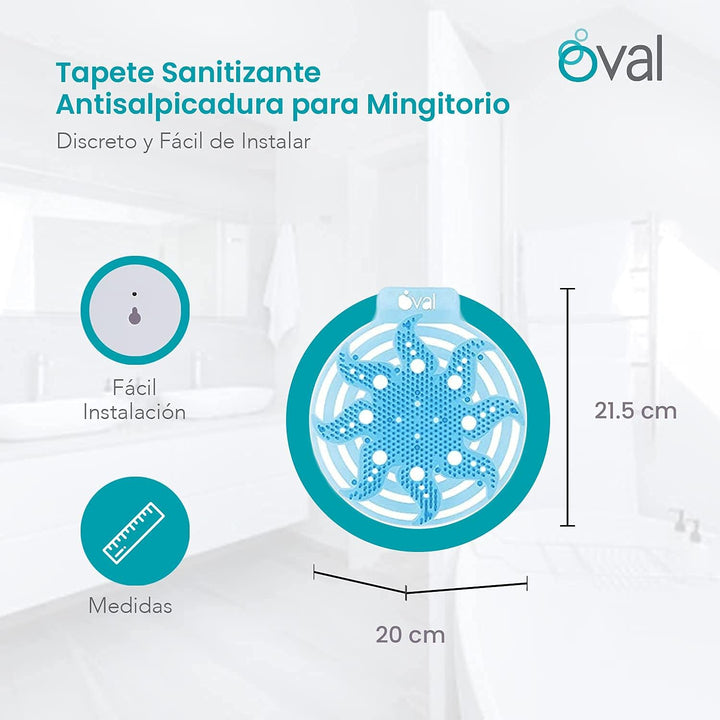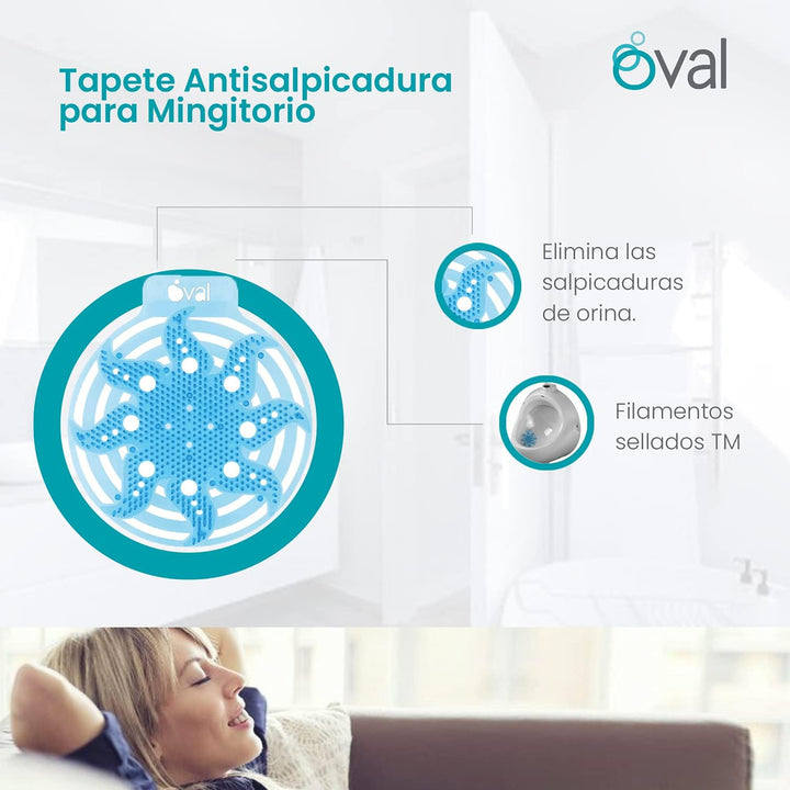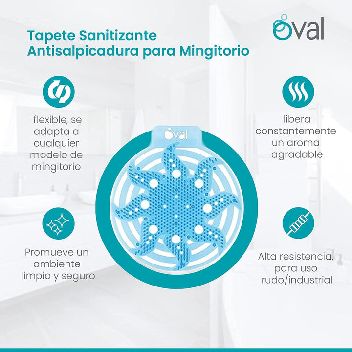 DESCRIPCIÓN | El tapete antisalpicaduras para mingitorio Oval, es una eficaz herramienta contra los malos olores en los baños; su tecnología de filamentos sellados evita las salpicaduras y su resina propietaria libera continuamente un aroma agradable. Estas dos características logran coadyuvar eficientemente en la lucha contra los malos olores. Tiene larga duración, hasta 30 días de liberación de aroma y es biodegradable. Emite un fresco aroma al contacto con los líquidos y contiene más aroma que cualquier otra marca. Está hecho de acuerdo a las regulaciones VOC del estado de California EUA. Es flexible, para que se pueda adaptar a cualquier tipo de mingitorio y es ideal para mingitorios que no utilizan agua (ecológicos). |